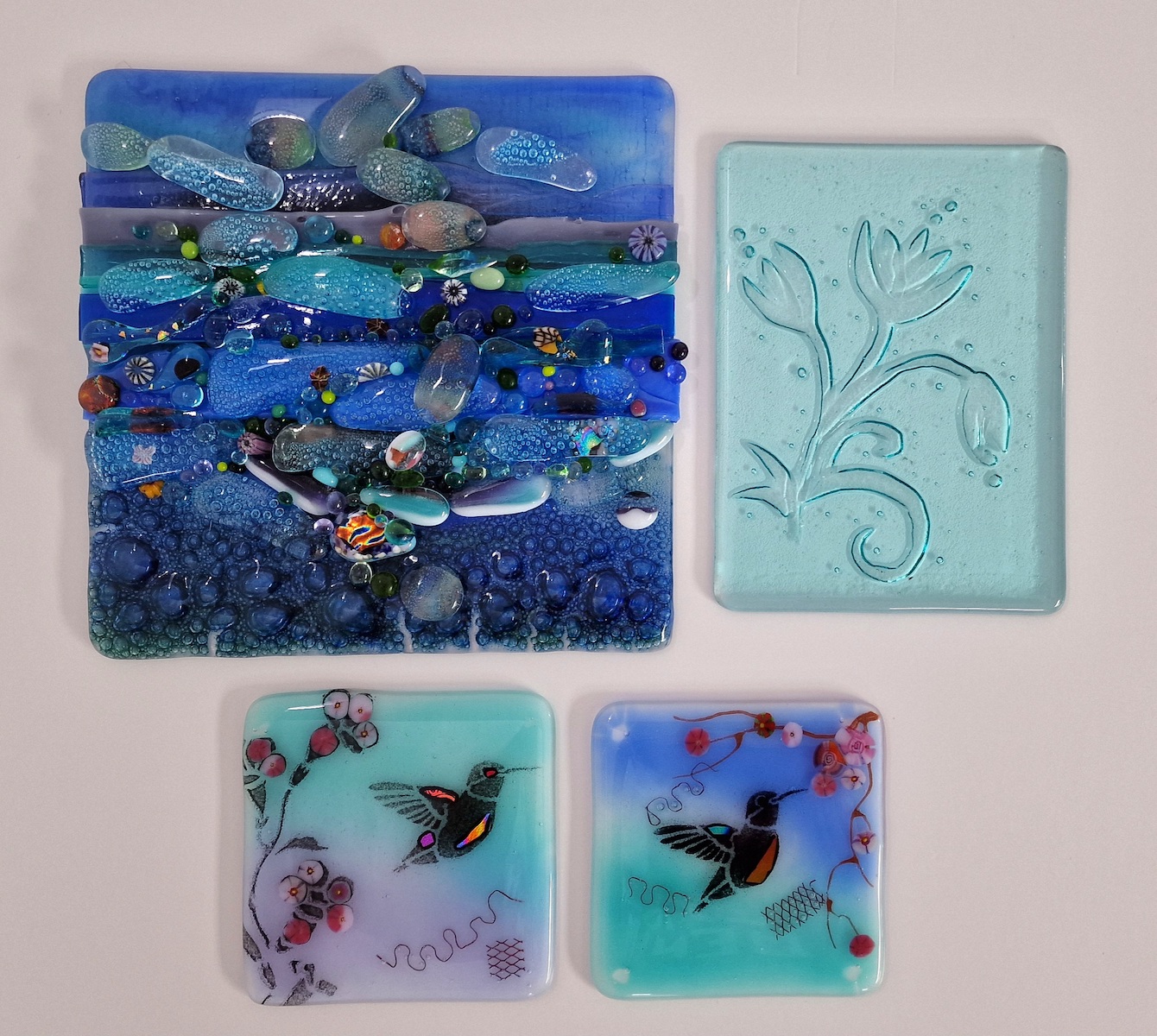 This workshop is the perfect starting point if you would like to set aside a day to maximise your learning as you get a taster of several techniques and options. We will first explain how fused glass works, all the various options you have with this wonderful medium, including slumping and the choices you have with powders, frit, stringers, murine, inclusions & fibre paper. You will then have a brief lesson on how to cut glass before we discuss what you will be making and what to consider when choosing your colour options and why.